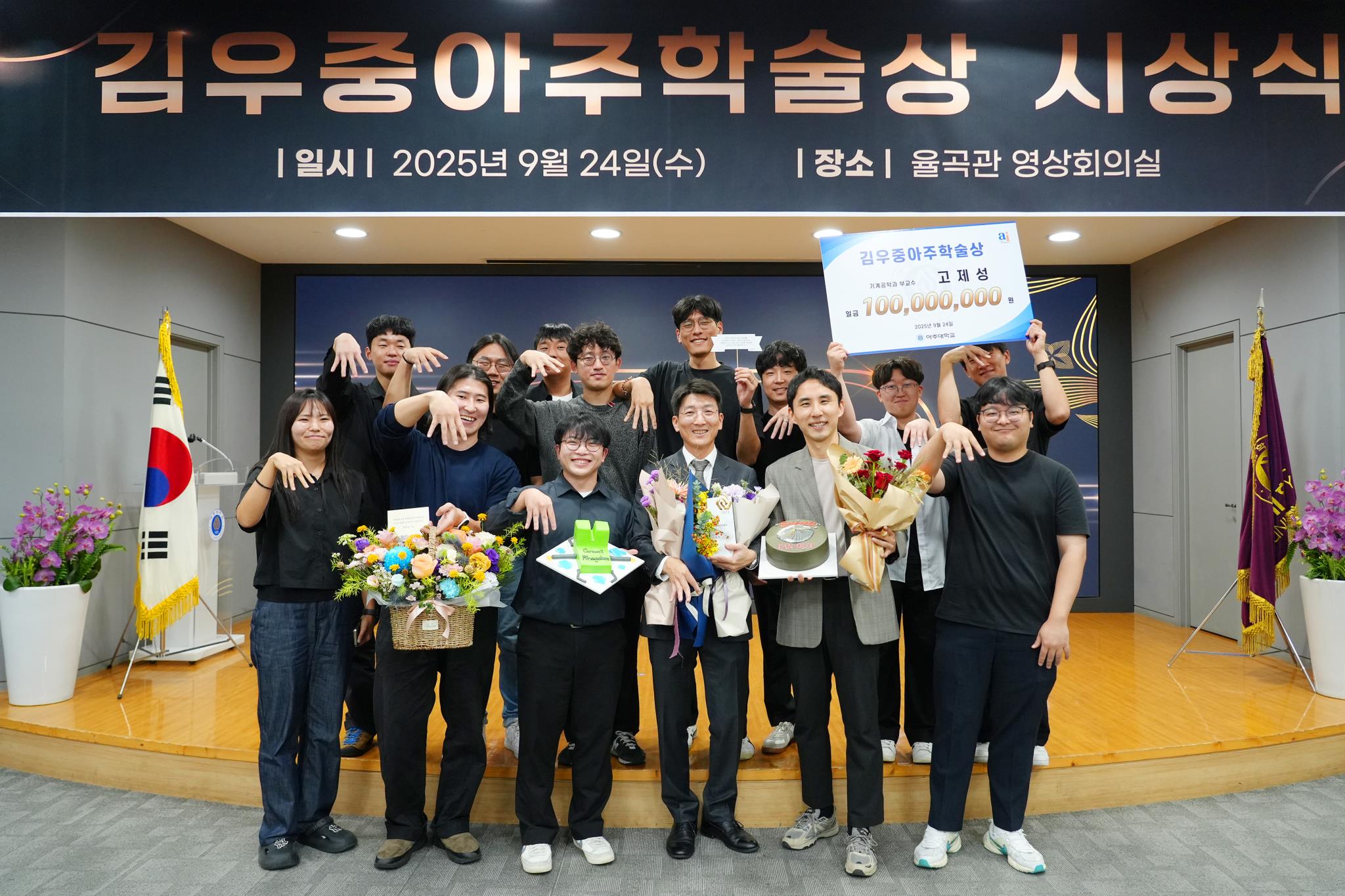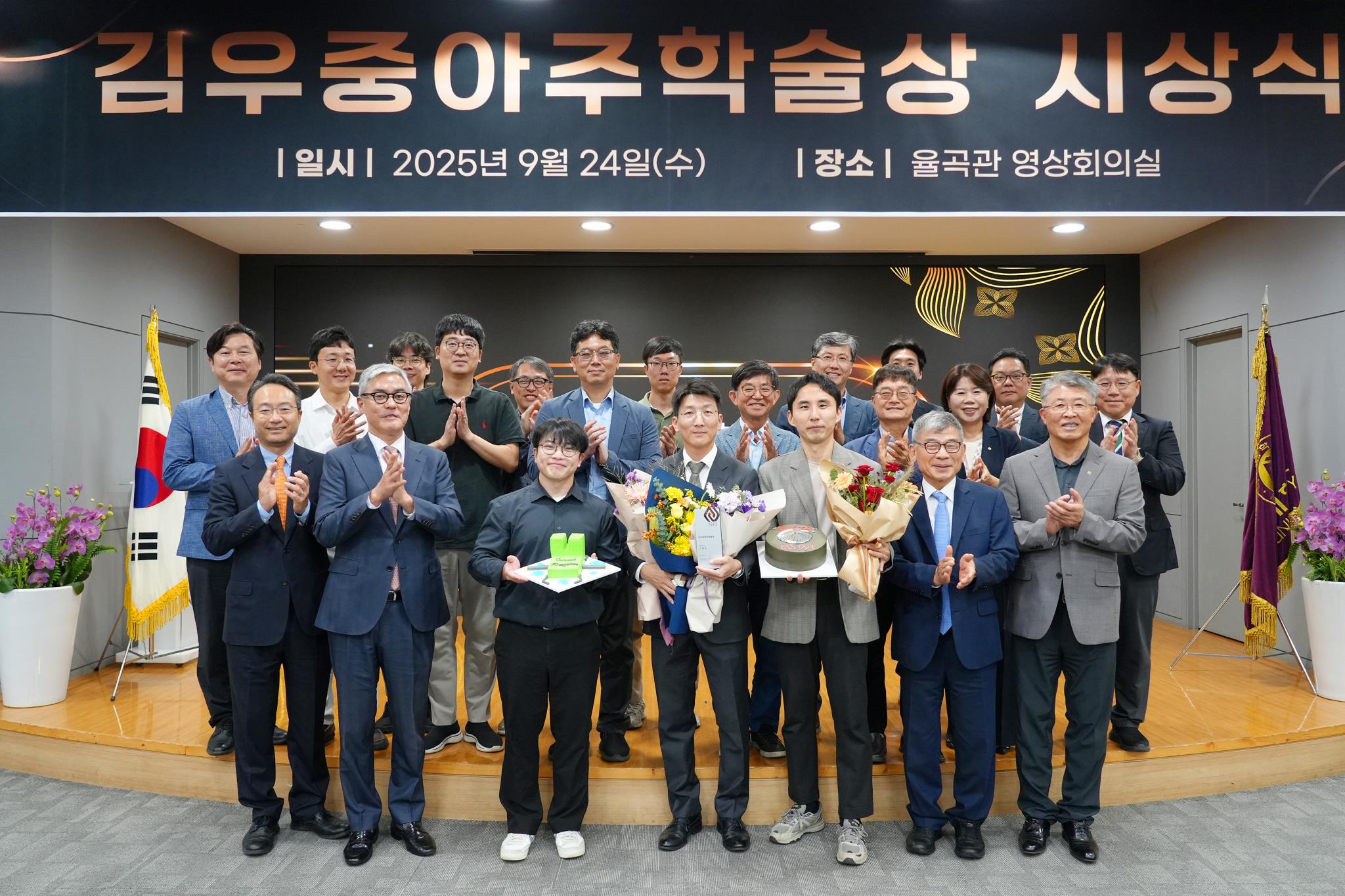24일 아주대 율곡관에서 <김우중아주학술상> 시상식이 개최됐다. ▲학술상 및 심의과정 소개(안병민 연구정보처장) ▲최기주 총장 인사말 ▲최종욱 기부자 축사 ▲연구내용 소개 및 소감 발표(고제성 교수)와 ▲상금 및 상패 증정이 이어졌다.