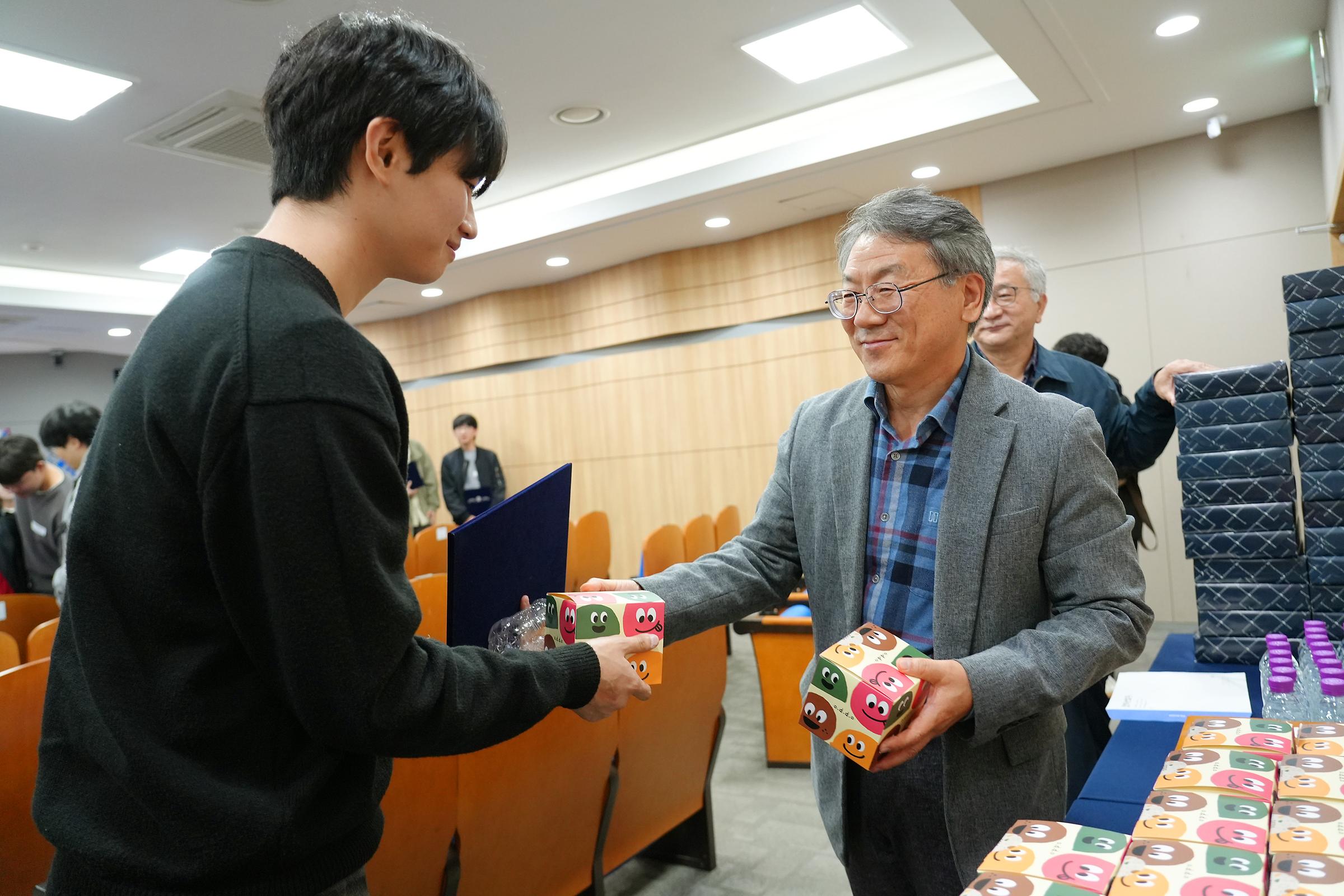 장학금 전달식은 10월24일 아주대 율곡관에서 개최됐다. 장학생들과 김경배 회장을 비롯한 아수장학회 구성원들이 함께 자리했다.
