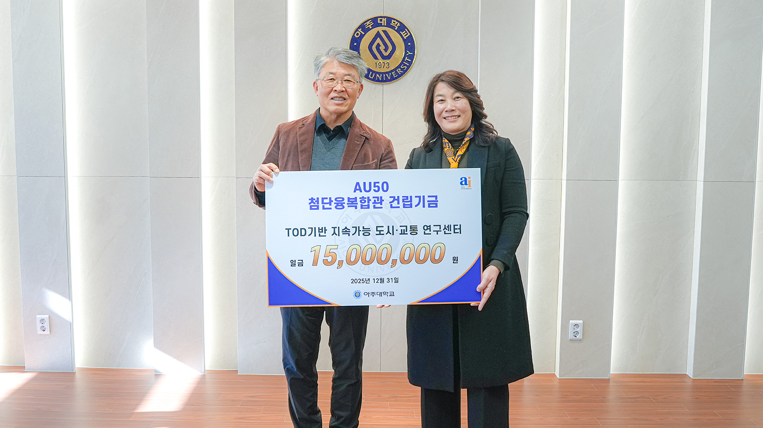 한편 아주대 TOD 연구센터는 지난 12월31일 ‘AU50 첨단융복합관 건립기금’으로 1500만원을 기부했다. 기부금 전달식에는 센터의 연구교수로 재직 중인 장정아·류인곤·최정윤·전교석·이용주·이현미 교수가 참석했다.