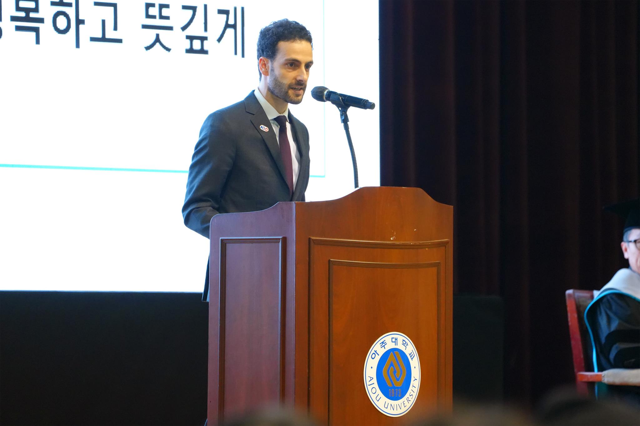 주한프랑스대사관을 대표해 행사에 자리한 피에르 모르코스(Pierre Morcos) 문화참사관은 “노력과 헌신의 결실로 아주대에 입학하게 된 학생 여러분에게 축하의 말을 전한다”라며 “오늘 이 자리는 풍요로운 배움과 만남 그리고 발견으로 가득 찬 중요한 시기의 시작을 의미하며, 여러분 모두가 마음껏 자신을 펼치며 성장하기를 바란다”고 말했다.