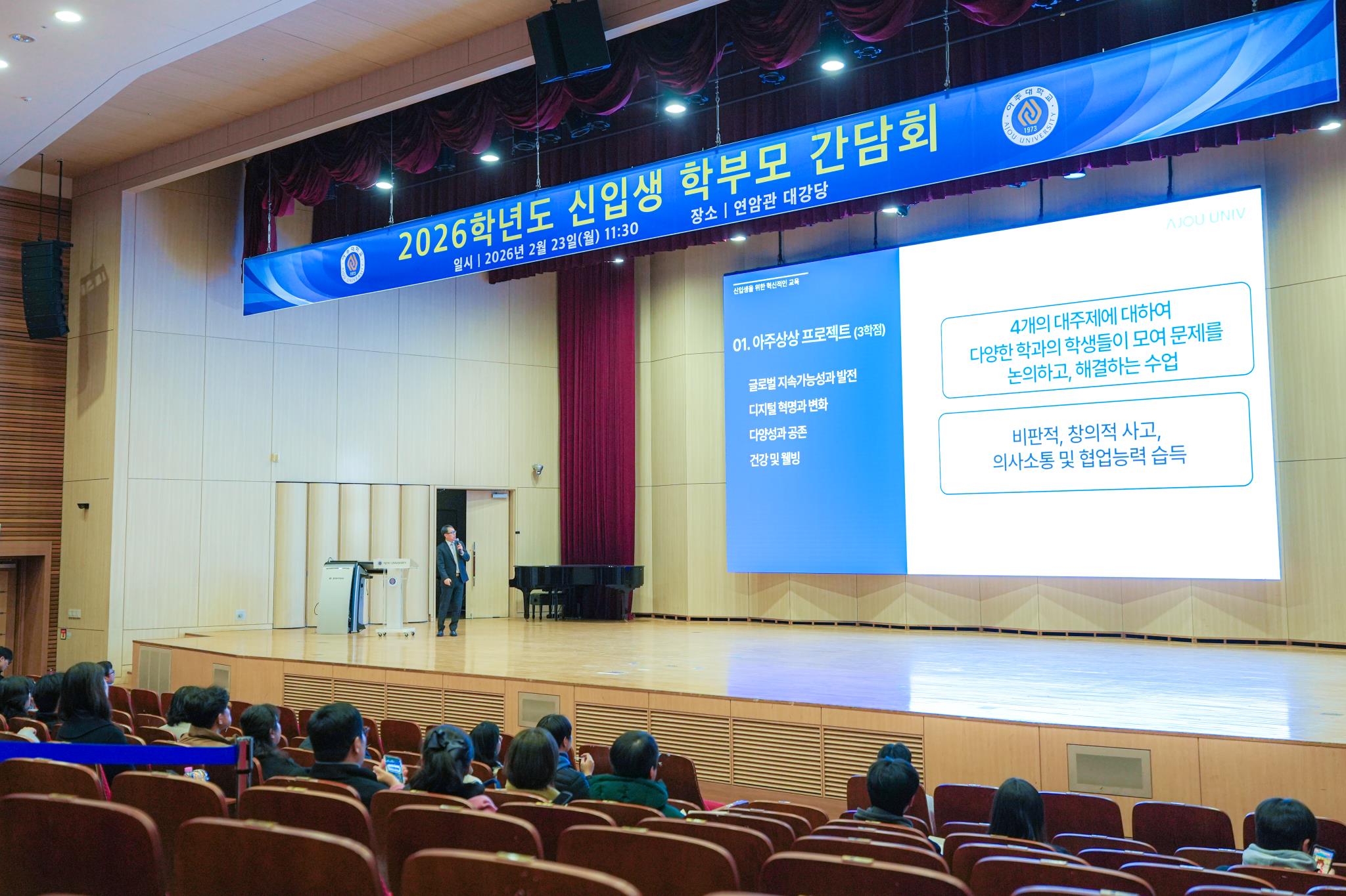 한편 이날 입학식에 이어 신입생 학부모·보호자를 대상으로 한 간담회도 진행됐다. 장우진 교무혁신처장(디지털미디어학과 교수)이 아주대가 최초로 도입한 ‘AI 기반 적응형 학습공간(Ajou Adaptive Learning Square, AALS)’을 비롯한 교육 혁신 프로그램과 ▲유연한 학사제도 및 전공 설계 지원 ▲국제 교육 프로그램(교환학생, 학부석사 연계 과정, 복수학위제) ▲취업 지원·진로 프로그램 등에 대해 소개했다. 이후 질의응답 시간도 마련됐다.
