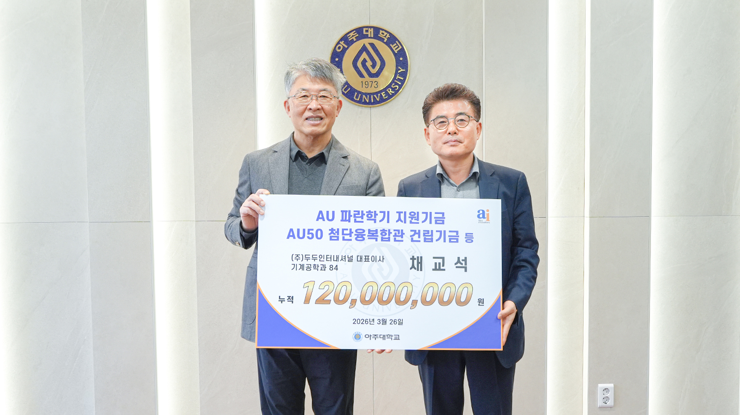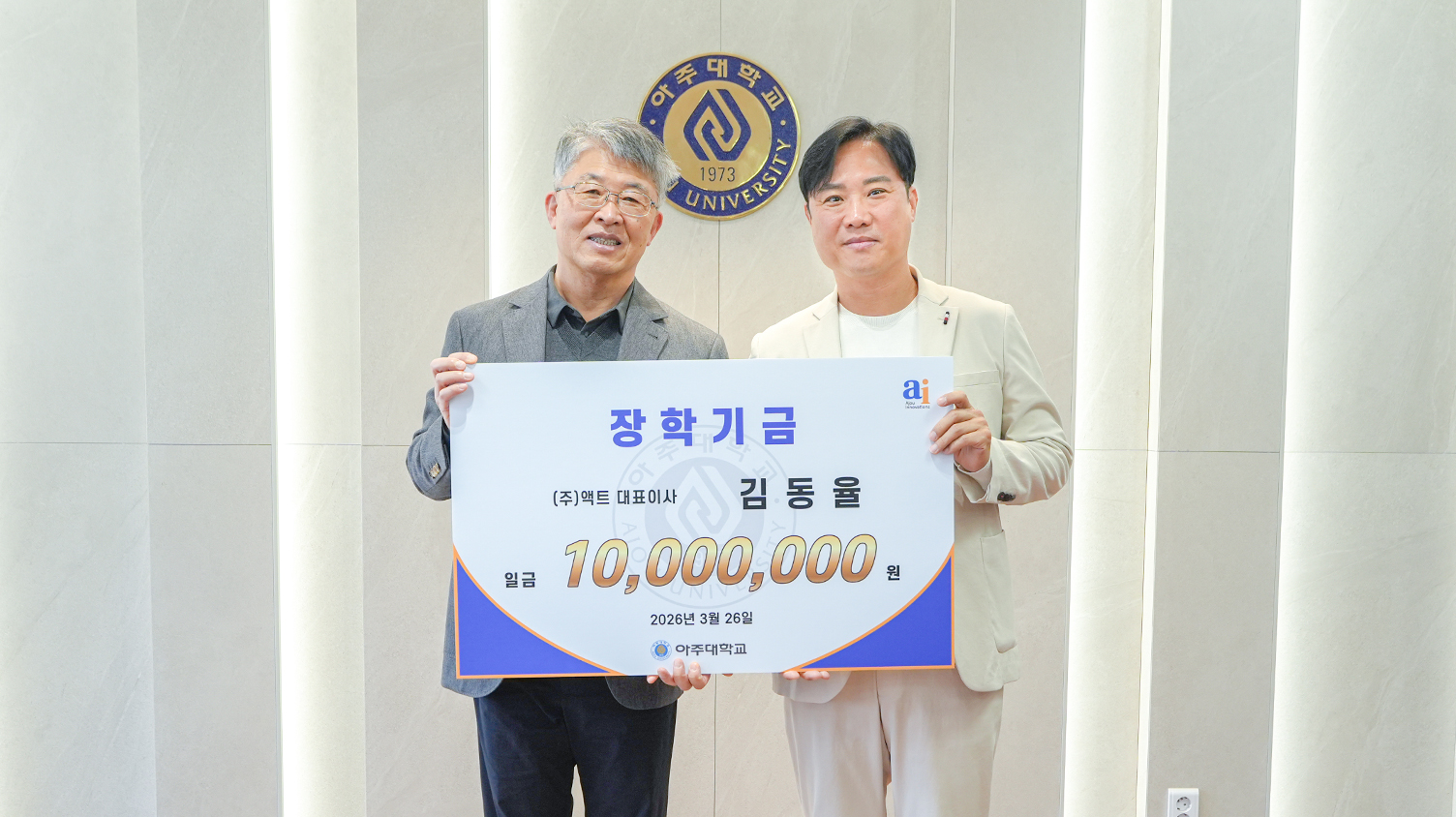26일 율곡관 총장실에서 열린 기부금 전달식에는 채교석 ㈜두두인터내셔널 대표이사, 이규식 ㈜연합개발 대표이사, 김동율 주식회사 액트(ACTS) 대표이사가 참석했다. 학교에서는 최기주 총장과 조경숙 대학발전본부장, 강민철 경영인텔리전스학과 교수가 자리했다. 최기주 총장이 아주가족을 대표해 감사 인사를 전하고, 감사패와 예우품을 전달했다.