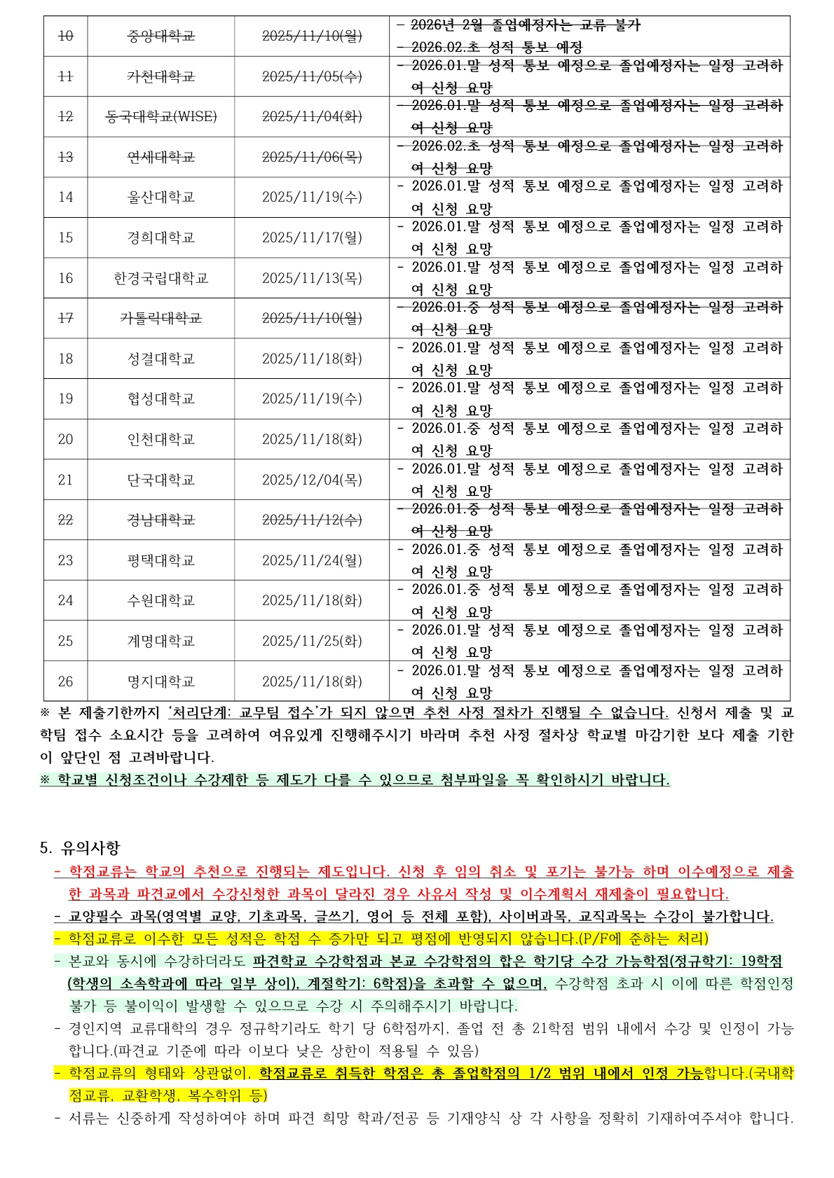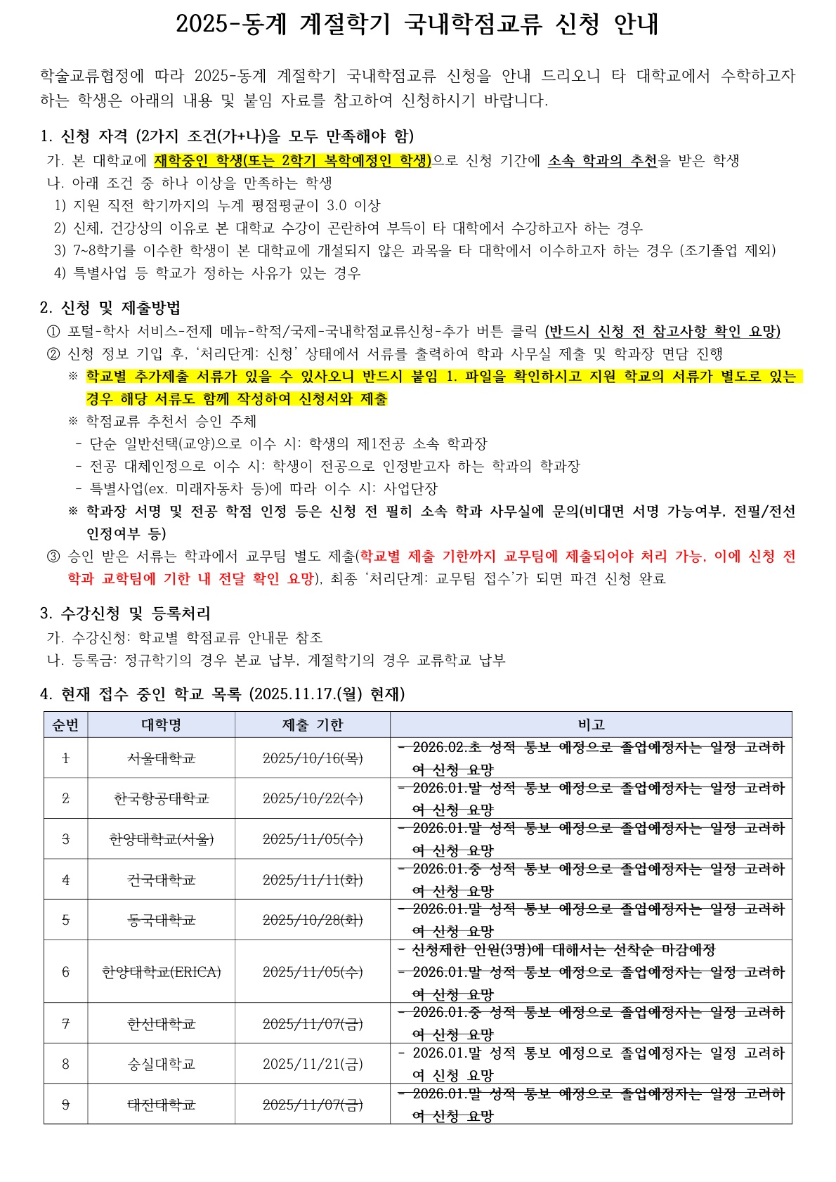 [학사] [학부/학사과정] (25.11.17.) 2025-동계 계절학기 국내대학 학점교류 신청 안내