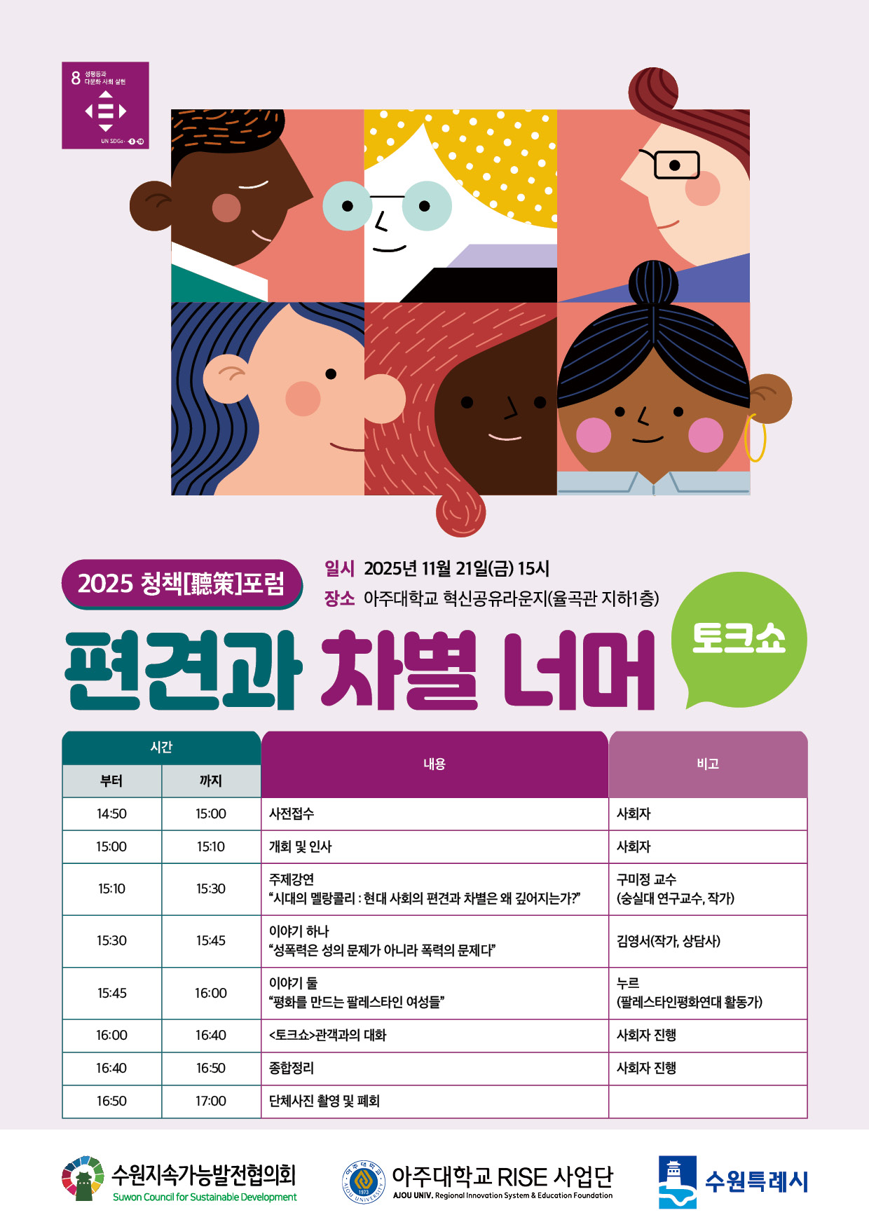 [행사] (재공지)[RISE] 아주대학교와 함께하는 찾아가는 지속가능발전대학, 「2025 청책[聽策]포럼 "편견과 차별 너머"」 신청 안내