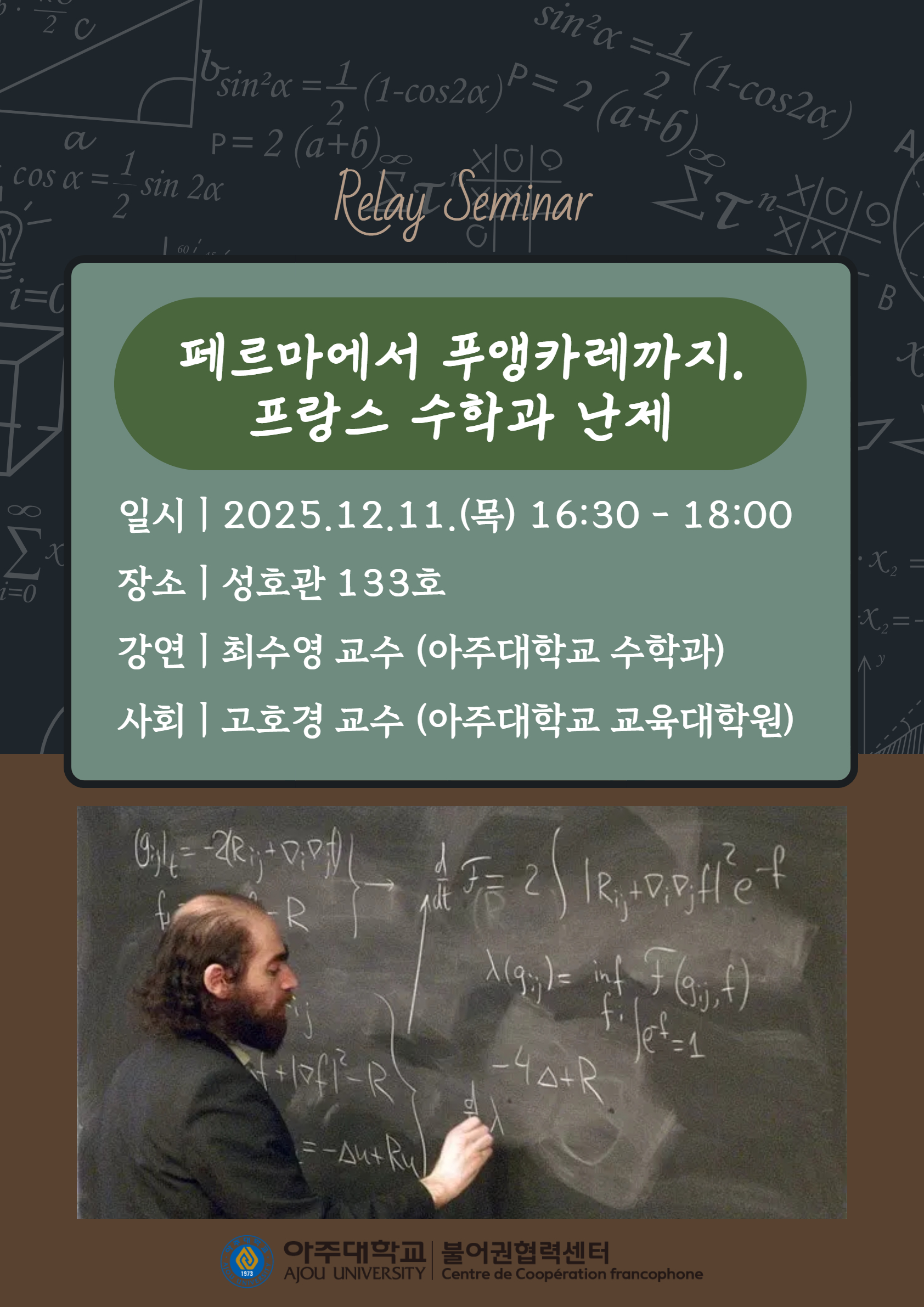 2025-2학기 불어권협력센터 릴레이 세미나 제 4차 세미나 <페르마에서 푸앵카레까지. 프랑스 수학과 난제> 안내