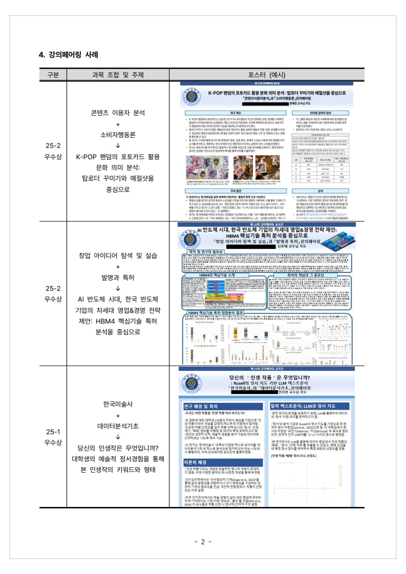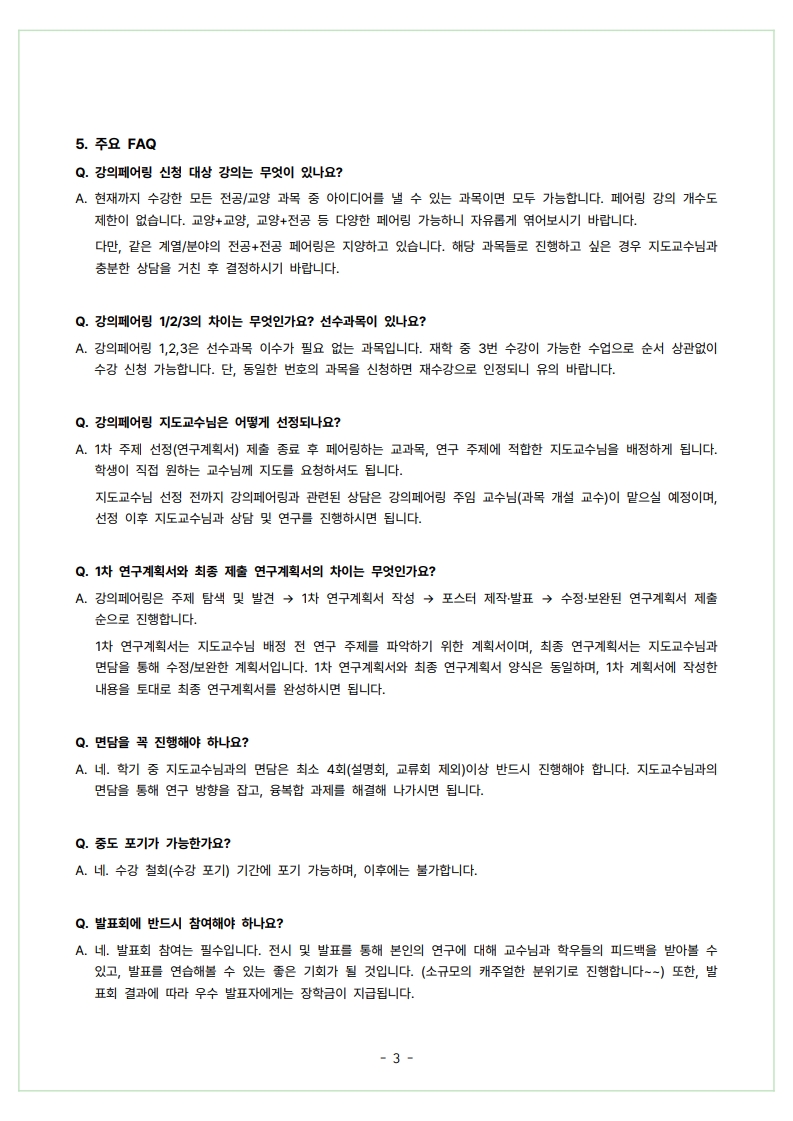 * ํ•œ๊ธ€ ์—ฐ๊ตฌ๊ณ„ํš์„œ ๋ฐ ๋ณด๊ณ ์„œ ์ž‘์„ฑ, ๊ฐ•์˜ํŽ˜์–ด๋ง ๋ฐœํ‘œํšŒ ์ฐธ์—ฌ ์‹œ ์งˆ์˜์‘๋‹ต์ด ์žˆ์–ด ํ•œ๊ตญ์–ด ์†Œํ†ต์ด ์–ด๋ ค์šด ์™ธ๊ตญ์ธ ํ•™์ƒ๋“ค์€ ์ˆ˜๊ฐ•์— ์–ด๋ ค์›€์ด ์žˆ์„ ์ˆ˜ ์žˆ์Šต๋‹ˆ๋‹ค.