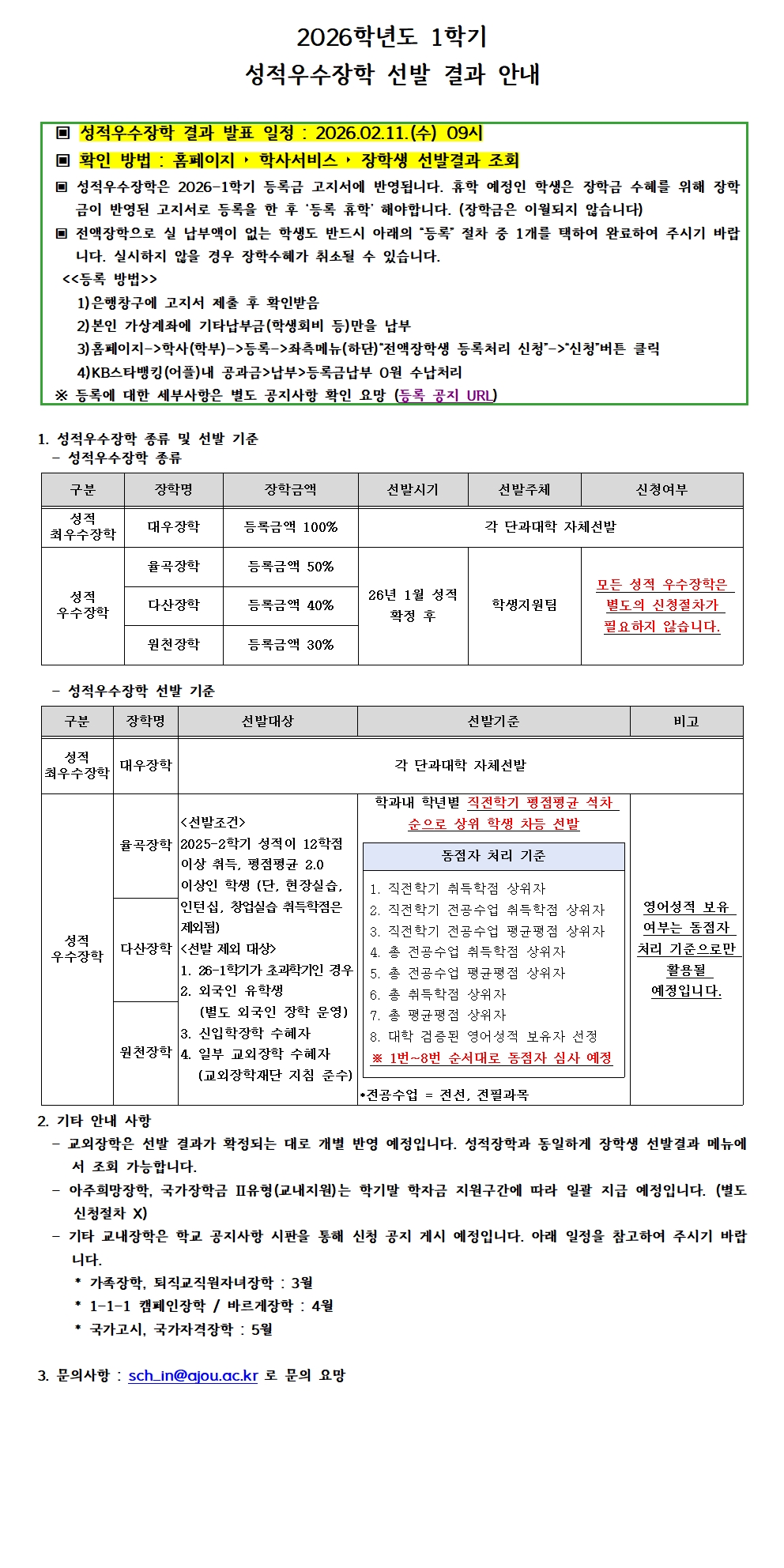 [장학] 2026학년도 1학기 성적우수장학 선발 결과 안내(2/11(수) 09시~)