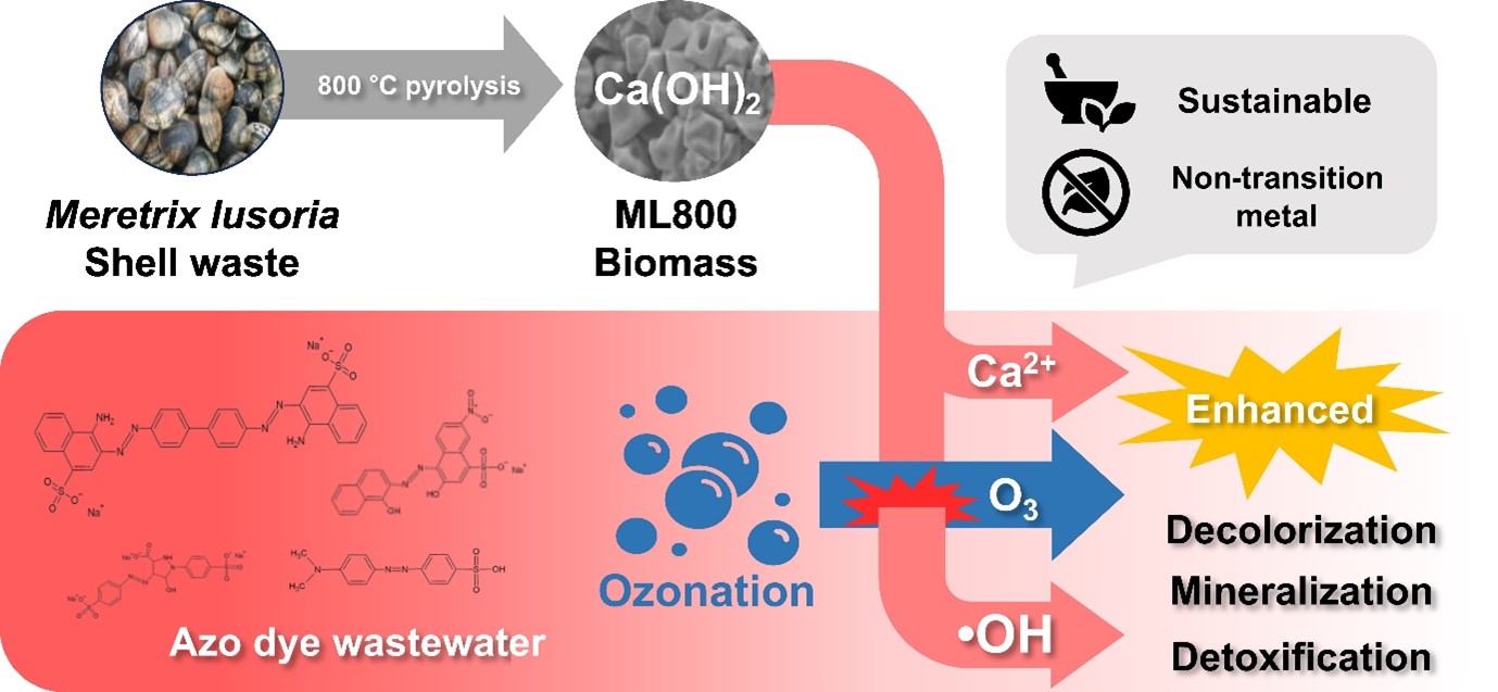 연구팀은 조개류 중 백합(Meretrix lusoria)의 껍질이 간단한 열분해를 통해 소석회(Ca(OH)2) 기반 기능성 소재(ML800)로 변환 가능하다는 점을 확인했다. 또한 해당 소재를 오존 공정에 투입할 경우 오존 분자(O3, E° = 2.07 V)의 분해를 촉진해, 강력한 산화 능력을 나타내는 수산화라디칼(•OH, E° = 2.80 V) 생성이 증폭됨을 확인했다.